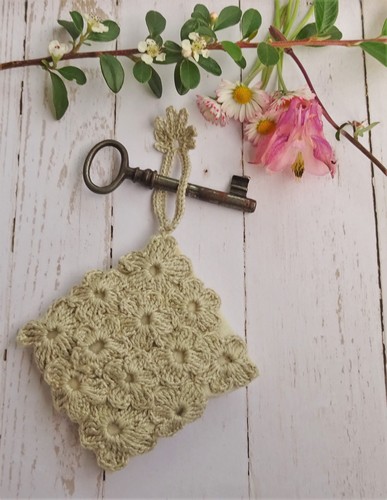 Voici un petit coussin à suspendre, orné d’un brin de muguet aux fragiles clochettes dentelées.